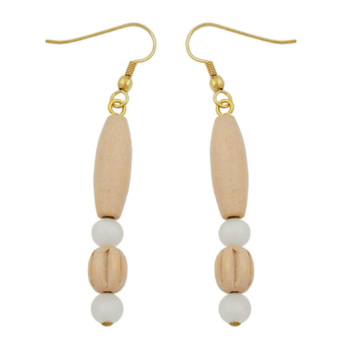 Ohrhaken Ohrhänger Ohrringe 60mm Holzperle hell und Kunststoffperle weiß-seidenmatt
