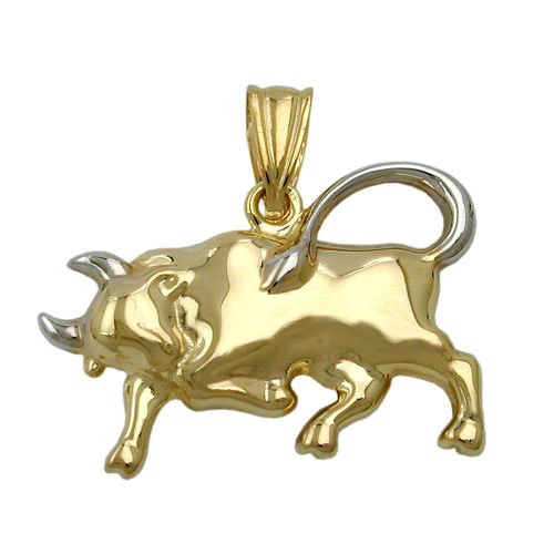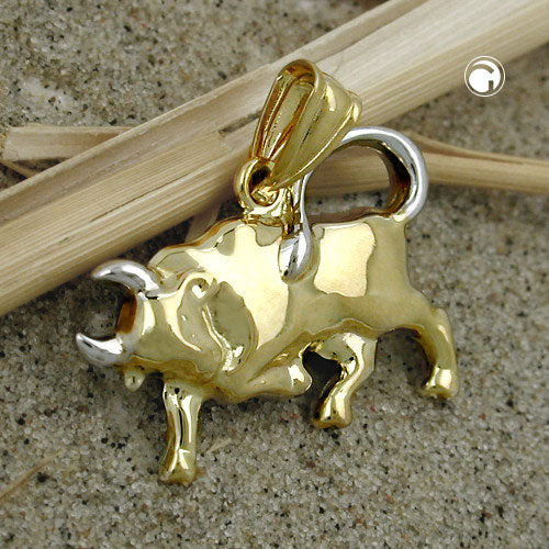 Wunderschöner 16x23mm großer Anhänger Stier in 375er Gelbgold (9 Karat) mit Bicolor-Effekt, gearbeitet in hochwertiger Juwelierqualität. Der Anhänger ist beidseitig flach ausgeformt und innen hohl. Die Hörner und der Schwanz sind zusätzlich rhodiniert, der ganze Anhänger glänzend poliert. Dieser Anhänger ist auch ein beliebter Sternzeichenanhänger für das Tierkreiszeichen Stier (engl. Taurus). Der starke Stier steht in der Astrologie Horoskop Zodiak für das Geburtsdatum vom 21. April bis 20. Mai. Ein persönliches Geschenk für jemand ganz besonderes, auch toll als Herrenschmuck.