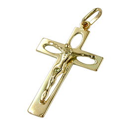 Modern gestalteter Kreuzanhänger Anhänger Kruzifix in in 585er Gelbgold (14 Karat), gearbeitet in hochwertiger Juwelierqualität. Ein besonderer Blickfang ist das blütenähnlich filigran durchbrochene Goldkreuz, das dadurch weicher und lieblicher wirkt. Das Jesuskreuz ist ein perfektes Geschenk für christliche Menschen zur Taufe, Kommunion oder Konfirmation. Es wird als ein persönliches Bekenntnis zum christlichen Glauben getragen, wobei das Kreuz mit Jesus überwiegend von Menschen mit römisch-katholischem Glauben getragen wird und Menschen mit evangelischem Glauben das (schlichtere) Kreuz ohne Jesus bevorzugen.