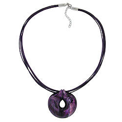 Diese wunderschöne Modeschmuck-Kette mit dem großen auffälligen Anhänger passt mit dem dunklen Lila-Farbton besonders gut zur Herbst- und Winterkleidung. Der wulstig ausgeformte Kunststoffring ist purpur-lila-weiß-marmoriert gefärbt und glänzend, jedes Teil ist durch die unterschiedliche Marmorierung ein Unikat. Durch den oberen Teil führen 6 Stränge dunkellilafarbener 1mm-Baumwollkordel. Das 55cm lange Collier wird mit einem silberfarbenen Karabiner plus Verlängerungskettchen aus eloxiertem Aluminium verschlossen.