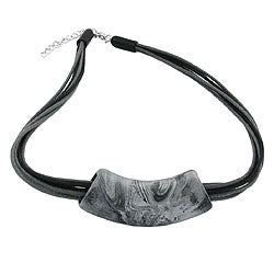 Mit dieser zeitlos schönen Modeschmuck-Kette können Sie den warmen Anthrazit-Farbton Ihrer Kleidung unterstreichen oder zusätzliche Akzente setzen. Der 54x19mm große Anhänger aus Kunststoff liegt wie ein flach gedrücktes und leicht gebogenes Rohr gut im Dekolleté an. Die Farben silbergrau und schwarz sind miteinander vermischt (marmoriert) und zusätzlich mattiert und jeder Anhänger ist einzigartig im Aussehen. Durch den Anhänger führen 6 Stränge von 1mm-Baumwollkordel, 4x grau und 2x schwarz und das 45cm lange Collier wird verschlossen mit einem goldfarbenen Karabiner plus Verlängerungskettchen aus eloxiertem Aluminium.