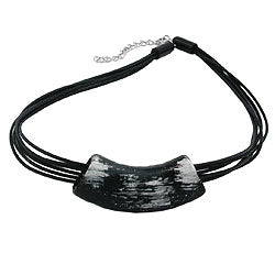 Mit dieser zeitlos schönen Modeschmuck-Kette im edlen Schwarz können Sie den Farbton Ihrer Kleidung unterstreichen oder zusätzliche Akzente setzen. Der 54x19mm große Anhänger aus Kunststoff liegt wie ein flach gedrücktes und leicht gebogenes Rohr gut im Dekolleté an. Der schwarz-glänzende Anhänger wurde zusätzlich silberfarbig bestrichen und jeder Anhänger ist einzigartig im Aussehen. Durch den Anhänger führen 6 Stränge schwarzer 1mm-Baumwollkordel und das 45cm lange Collier wird verschlossen mit einem silberfarbenen Karabiner plus Verlängerungskettchen aus eloxiertem Aluminium.