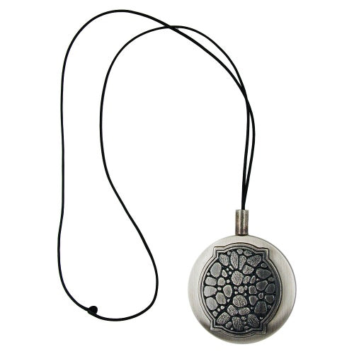 Der fantasievolle Anhänger dieser Kette ist eine runde Scheibe mit einer aufgesetzten Platte, die wie Krokodillederhaut gemustert ist. Die Rückseite ist gewichtsparend hohl und die gesamte Oberfläche wurde antik-silberfarben galvanisch beschichtet. Der 67mm große Anhänger aus Kunststoff hängt an einer lüstrierten schwarzen 1mm-Baumwollkordel, die einen verstellbaren Schiebeknoten zum Regulieren der Länge besitzt, Gesamtlänge 90cm. Lange Ketten eignen sich gut als Pulloverketten und können ohne den Verschluss zu öffnen über den Kopf angelegt werden. Die rustikale Modeschmuck-Kette passt mit dem neutralen grauen Farbton besonders gut zur Jeansmode und zur Herbst- und Winterkleidung. Lange mollige Kleider und farbige Oberteile bekommen mit dieser auffälligen Kette das schmückende Extra.