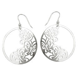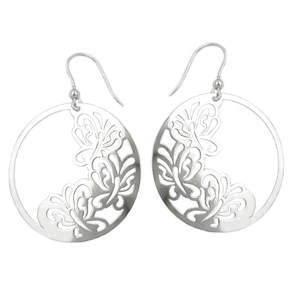 Diese Ohrringe sind ein echter Blickfang! An den Ohrhaken aus Sterling Silber 925 hängen auffallend große, runde Scheiben, ca. 37mm im Durchmesser, mit je drei Schmetterlingen, gearbeitet in hochwertiger Juwelierqualität. Das romantisch verspielte Schmetterlingsmotiv ist filigran mit Lasertechnik ausgeschnitten. Dadurch pendeln die glänzenden Ohrringe aus hauchdünnem Silberblech federleicht am Ohr. Dieser ausgefallene, wunderschöne Ohrschmuck ist Favorit für ihren täglich getragenen Lieblingsschmuck.