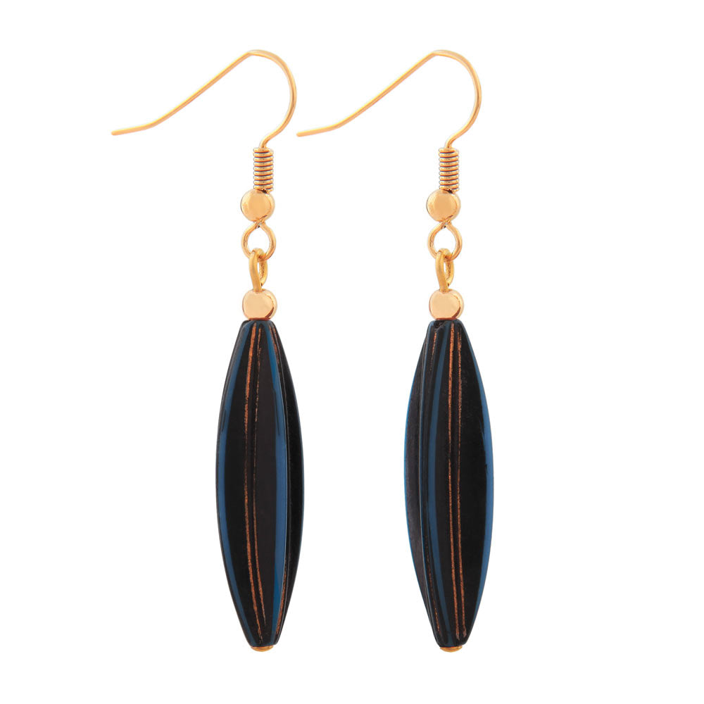 Diese federleichten Modeschmuck-Ohrringe setzen den passenden i-Punkt zu den Farben Ihrer Kleidung. Der 50mm lange Ohrhänger besteht aus einer einzigen 30x9mm großen, dunkelblauen Rillenolive aus Kunststoff mit goldfarben ausgewischten Vintage-Effekt, einer kleinen goldfarbenen Perle als Topping und einem goldfarbenen Ohrhaken aus Messing. Farbiger Schmuck betont die Farben der Kleidung oder setzt zusätzliche Akzente und rundet Ihren Auftritt glanzvoll ab. Verkauf nur paarweise.