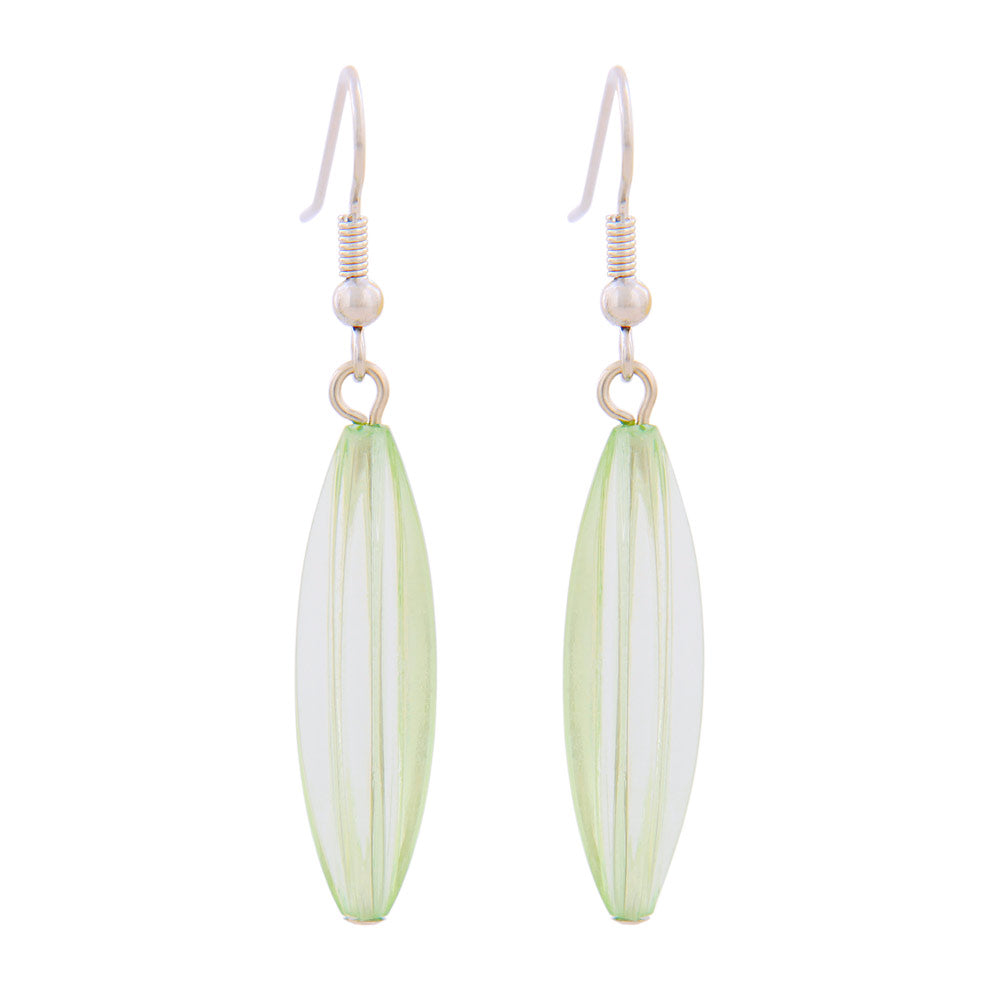 Diese federleichten Modeschmuck-Ohrringe setzen den passenden i-Punkt zu den Farben Ihrer Kleidung. Der 50mm lange Ohrhänger besteht aus einer einzigen 30x9mm großen, hellgrün-transparenten Rillenolive aus Kunststoff und einem silberfarbenen Ohrhaken aus Messing (Weißbronze). Farbiger Schmuck betont die Farben der Kleidung oder setzt zusätzliche Akzente und rundet Ihren Auftritt glanzvoll ab. Verkauf nur paarweise.