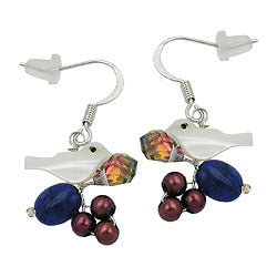 Verspielte kleine bunte Modeschmuck-Ohrringe Chandelier-Ohrhänger mit einem kleinen Vogel aus Muschelimitat, um ihn herum wie Früchte befinden sich eine kleine facettierte, schillernde Perle in Tropfenform sowie eine blaue und 3 kleine dunkelbraune Glasperlen. Der Ohrschmuck pendelt an einem geschlossenen silberfarbenen Ohrhaken, Gesamtlänge 35mm. Verkauf paarweise.
