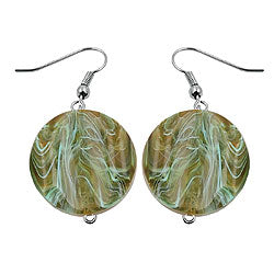 Die kleinen runden Modeschmuck-Ohrringe setzen den passenden i-Punkt zu den Farben Ihrer Kleidung. Der Ohrhänger besteht aus einem Pendel mit einer 22mm großen, 8mm dicken, oliv-türkisgrün-marmorierten Kunststoffperle Scheibe mit reliefartig gestalteter Oberflächenstruktur, befestigt an einem silberfarbenen Ohrhaken aus Messing (Weißbronze), Gesamtlänge mit Haken 44mm. Verkauf paarweise.
