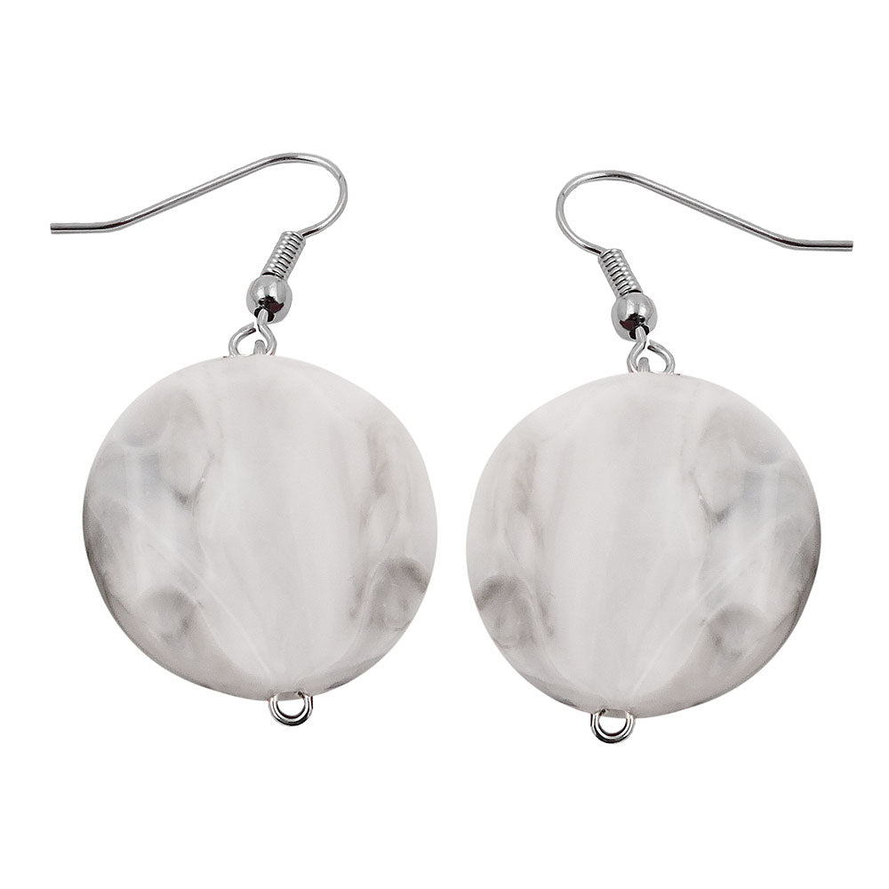 Die kleinen runden Modeschmuck-Ohrringe setzen den passenden i-Punkt zu den Farben Ihrer Kleidung. Der Ohrhänger besteht aus einem Pendel mit einer 22mm großen, 8mm dicken, grau-weiß-marmorierten Kunststoffperle Scheibe mit reliefartig gestalteter Oberflächenstruktur, befestigt an einem silberfarbenen Ohrhaken aus Messing (Weißbronze), Gesamtlänge mit Haken 44mm. Verkauf paarweise.