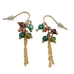 Verspielte multicolor-Modeschmuck-Ohrringe mit kleinen braunen, türkisfarbenen, grünen gekettelten Glasperlen, aus deren Bündel zwei dünne goldfarbene Erbskettchen herausbaumeln. Das Chandelier Ohrpendel ist an einem goldfarbenen Ohrhaken befestigt, Gesamtlänge mit Haken 45mm. Ohrschmuck betont zusätzlich das Gesicht und rundet Ihren Auftritt glanzvoll ab. Verkauf paarweise.
