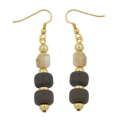 Diese federleichten Modeschmuck-Ohrringe setzen den passenden i-Punkt zu dem Naturtrend in Ihrer Kleidung. Der Ohrhänger besteht aus einem Pendel aus Kunststoffperlen: zwei schlammfarben eingefärbte Rädchen-Perlen, einer unrunden beige-marmorierten Steinperle und vier goldfarbenen 5mm-Rundperlen als Zwischenteile, befestigt an einem goldfarbenen Ohrhaken aus Messing, Gesamtlänge: 56mm. Alle Bestandteile des Ohrschmucks wurden in Deutschland produziert und in Handarbeit - made in germany - fertiggestellt. Verkauf paarweise.