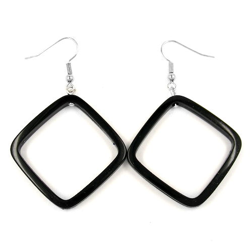 Diese federleichten, auffallend großen Modeschmuck-Ohrringe bestehen nur aus einem schwarz-glänzenden, 32x32mm großen, quadratischen Viereckrahmen aus Kunststoff. Der silberfarbene Ohrhaken aus Messing (Weißbronze) ist an einer Ecke befestigt, die Gesamtlänge des Ohrrings beträgt ca. 60mm. Alle Bestandteile des Ohrschmucks wurden in Deutschland produziert und in Handarbeit - made in germany - fertiggestellt. Verkauf paarweise.