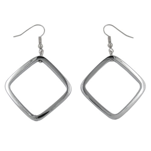 Diese federleichten silberfarbenen Modeschmuck-Ohrringe sind ein echter Blickfang. Der Ohrhänger besteht nur aus einem silber-glänzenden 32x32mm viereckigen Rahmen aus Kunststoff, an einer Ecke befestigt mit einem silberfarbenen Ohrhaken aus Messing (Weißbronze), Gesamtlänge 58mm. Alle Bestandteile des Ohrschmucks wurden in Deutschland produziert und in Handarbeit - made in germany - fertiggestellt. Verkauf paarweise.