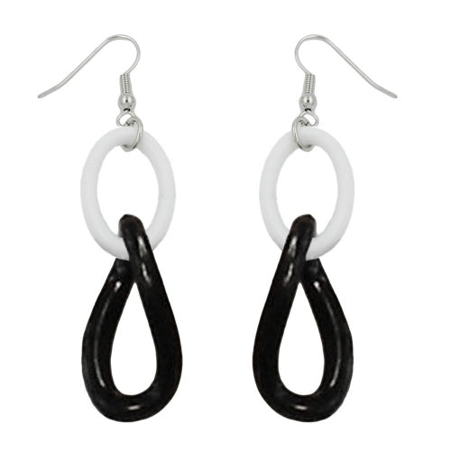 Diese federleichten Modeschmuck-Ohrringe im pragmatischen Schwarz-Weiß-Stil setzen den passenden i-Punkt zu den klassischen Grundfarben in Ihrer Kleidung. Der dekorative Ohrhänger besteht aus einem Pendel mit zwei ovalen Ringen aus Kunststoff - weiß, gerade: 25x16mm und schwarz, leicht in sich gedreht: 35x18mm - befestigt an einem silberfarbenen Ohrhaken aus Messing (Weißbronze), Gesamtlänge mit Haken 73mm. Alle Bestandteile des Ohrschmucks wurden in Deutschland produziert und in Handarbeit - made in germany - fertiggestellt. Verkauf paarweise.