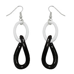 Diese federleichten Modeschmuck-Ohrringe im pragmatischen Schwarz-Weiß-Stil setzen den passenden i-Punkt zu den klassischen Grundfarben in Ihrer Kleidung. Der dekorative Ohrhänger besteht aus einem Pendel mit zwei ovalen Ringen aus Kunststoff - weiß, gerade: 25x16mm und schwarz, leicht in sich gedreht: 35x18mm - befestigt an einem silberfarbenen Ohrhaken aus Messing (Weißbronze), Gesamtlänge mit Haken 73mm. Verkauf paarweise.