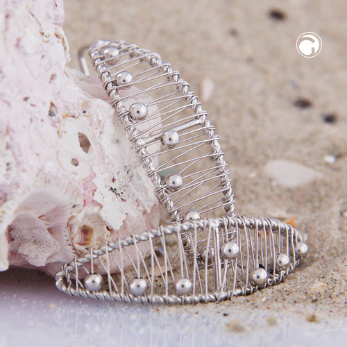 Extravagante, wunderschön verspielte Ohrringe aus Sterling Silber 925, gearbeitet in hochwertiger Juwelierqualität. In dem 30x8mm großen, leicht gebogenen, aufwendig gestalteten Spitzoval sind dünne Silberdrähte mit winzig kleinen, 2mm großen Kugeln zu einem filigranen Geflecht verdrahtet die 7 Kügelchen rutschen auf den quergespannten Drähten neckisch hin und her. Der ca. 23mm große Ohrhaken sorgt für einen sicheren Halt und ist leicht einzusetzen. Für langanhaltende Freude an diesem Ohrschmuck wurde die Oberfläche anlaufgeschützt rhodiniert.