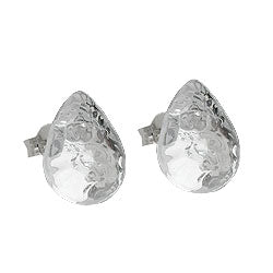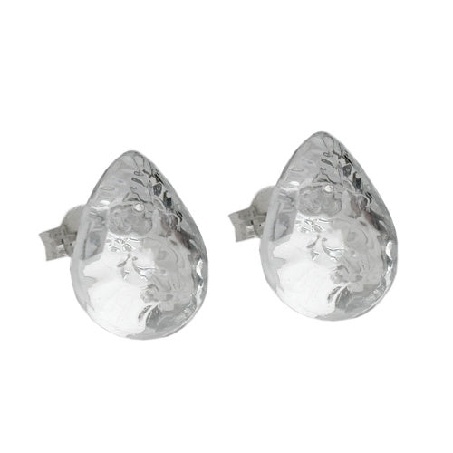 Universell tragbare leichte Modeschmuck-Ohrringe in Tropfenform in kristallklar-verspiegelt-transparenter Farbe. Der halbrund gewölbte, 14mm große Ohrstecker aus Kunststoff hat eine gravierte (gemusterte) Oberfläche und einen rhodinierten silberfarbenen Steckerstift aus Messing. In Deutschland hergestellter Modeschmuck. Verkauf paarweise.