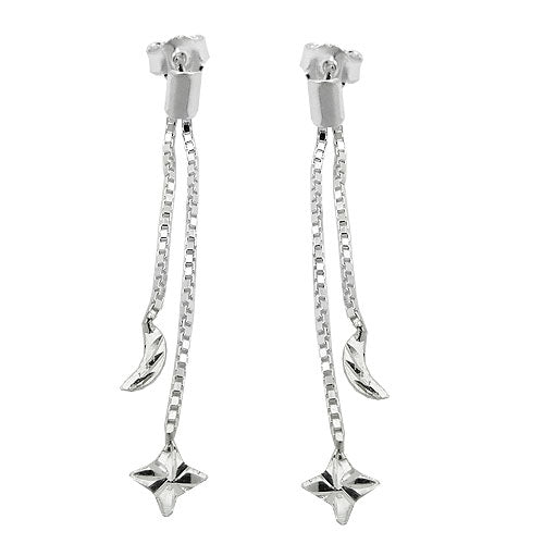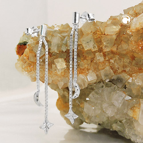 Romantisch verspielter Ohrstecker mit zwei Kettchen in Sterling Silber 925, gearbeitet in bester Juwelierqualität. Die federleicht baumelnden, ca. 1mm starken Venezianerkettchen ziert am Ende je eine Mondsichel und ein vierzackiger Stern, beide diamantiert. Die zwei Kettchen sind unterschiedlich lang, das längste ist ca. 41mm lang. Schlicht und einfach: generationenübergreifender Teenagerschmuck.