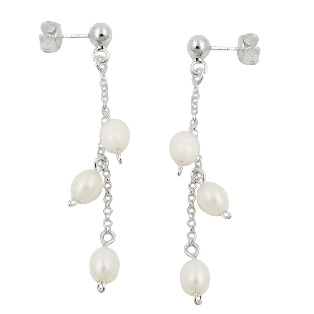 Romantisch verspielte Ohrstecker in Sterling Silber 925, 45mm lang. An einer Erbskette hängen je drei ca. 4,5x5mm große (kleine) ovale Süßwasserzuchtperlen, Größe und Form der einzelnen Perlen können leicht unterschiedlich sein. Die hochwertige Juwelierqualität sorgt für langanhaltende Freude an diesem eleganten Schmuckstück. Wunderschöner Brautschmuck, der auch im Alltag getragen werden kann.