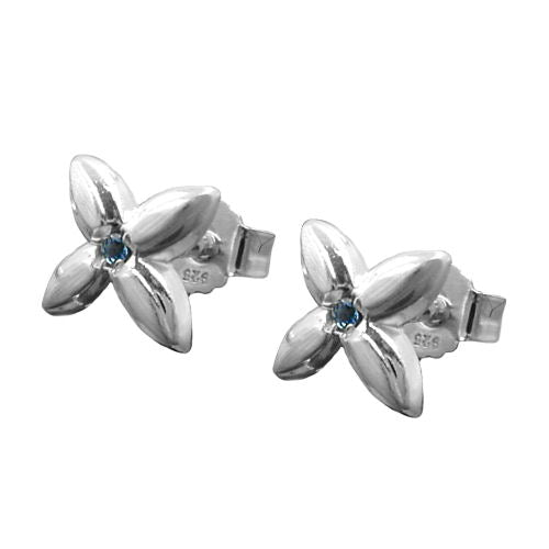 Wunderschöner 6,5x6,5mm kleiner stilisierter Blumen-Ohrstecker in Sterling Silber 925, gearbeitet in hochwertiger Juwelierqualität. In der Mitte der vier strahlenförmig angeordneten, leicht gewölbten Blütenblätter funkelt ein kleiner dunkelblauer synthetischen Spinell, die Rückseite ist verbödet (geschlossen). Dezent schmückend, denn weniger ist manchmal mehr!