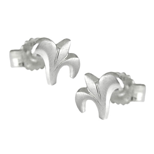 Anmutig geschwungener, 7x6mm kleiner Ohrstecker aus Sterling Silber 925, gearbeitet in hochwertiger Juwelierqualität. Blatt, Blüte oder Ranke? Das florale Motiv mit den 3 gebogenen Blättern erinnert auch entfernt an eine Lilie im Wappenschmuck. Die Rückseite des kleinen, mattierten Ohrsteckers ist hohl. Ein zeitlos schönes Schmuckstück für viele Gelegenheiten.