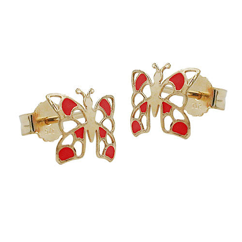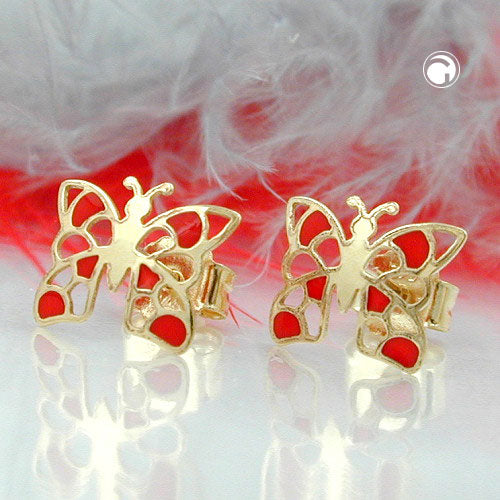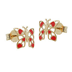 Sehr filigran gearbeiteter Ohrstecker Schmetterling in 1A-Juwelierqualität aus 375er Gold (9 Karat), die Flügel sind rot emailliert. Das modische i-Tüpfelchen, nicht nur als Kinderschmuck für kleine Mädchen! Das Motiv Schmetterling steht für Neubeginn und Wiedergeburt - aus einer Raupe, die am Boden kriecht, entsteht nach der Verpuppung ein wunderschöner Schmetterling, der mit scheinbar verspielter Leichtigkeit überall hinfliegen kann. Ein Sinnbild zum Träumen!