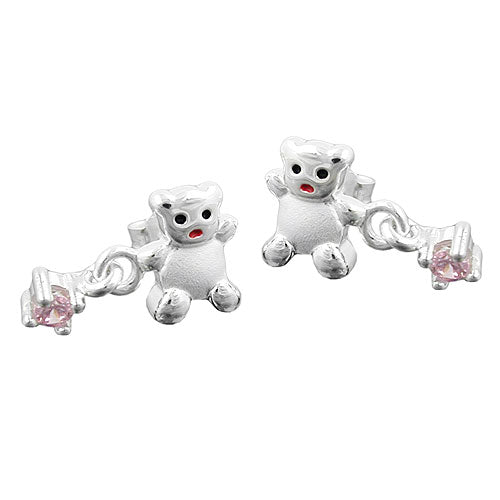 Neckischer 8x15mm kleiner Kinderohrring Ohrstecker Bärchen in Sterling Silber 925, gearbeitet in hochwertiger Juwelierqualität. Der Bauch ist mattiert, die Augen sind schwarz, der Mund rot lackiert und an einem Arm hängt als Anhängsel ein kleiner funkelnder pink rosafarbenen Zirkonia. Ein modisches i-Tüpfelchen für die kleine Teddy-Mutti. Ein wunderschönes Kinderschmuck Geschenk zum Geburtstag, zur Schuleinführung oder einfach mal zwischendurch.