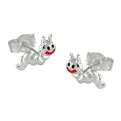 Das modische i-Tüpfelchen für kleine Mädchen! Witziger Kinderohrring Ohrstecker, kleiner Wurm mit lachendem Gesicht, aus Sterling Silber 925, verarbeitet in hochwertiger Juwelierqualität. Oberfläche abwechselnd matt und glänzend poliert, die schwarzen Augen und der lachende rote Mund sind auflackiert. Aus einer kleinen Raupe, die am Boden kriecht, entsteht nach der Verpuppung ein wunderschöner Schmetterling, der mit scheinbar verspielter Leichtigkeit überall hinfliegen kann. Ein wunderschönes Kinderschmuck Geschenk zur Schuleinführung, Geburtstag oder einfach mal zwischendurch!