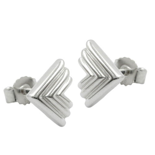Wie 3 kleine ineinander geschobene Winkel wirkt dieser plastische Ohrschmuck in Sterling Silber 925 sehr dekorativ am Ohr. Die Rückseite des 9x7mm großen Silberohrsteckers, hergestellt in sehr guter Juwelierqualität, ist feinkörnig verbödet (geschlossen). Mit diesem gefälligen geometrischen Muster ist dieser fast dreieckige Ohrschmuck ideal für den alltäglichen Gebrauch.