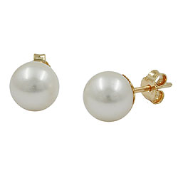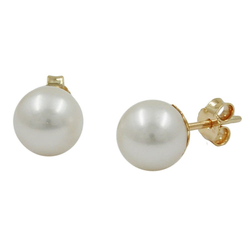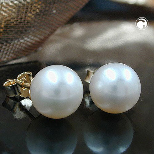 Klassische Perlenohrringe mit einer ca. 8mm großen, runden Süßwasserzuchtperle in 375er Gelbgold (9 Karat)  die Gewichtsangabe der Ohrstecker mit Perle ist inklusive der Perlen. Die schlichte Perle gilt als Symbol von Reinheit und Schönheit. Zuchtperlen werden in Süßwasserseen und Flüssen gezüchtet und unterscheiden sich nur durch den fehlenden Kern. Die Eigenschaften von Zuchtperlen und Naturperlen, die chemische Zusammensetzung, die Härte und die optischen Eigenschaften sind gleich. Ein Geschenk der Natur für die Schönheit der Natur. Wunderschöner Brautschmuck, der auch zu anderen festlichen Anlässen und im Alltag getragen werden kann.