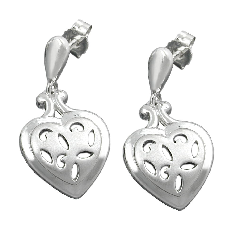 Herz ist Trumpf! Wunderschöner, 24x12mm großer Ohrhänger Ohrstecker mit Herz-Anhänger in Sterling Silber 925, gearbeitet in hochwertiger Juwelierqualität. Die gewölbte Herzmitte ist mattiert und filigran durchbrochen, der Rand ist glänzend. Das Herz steht weltweit als Symbol für Liebe, Güte und Menschlichkeit. Ein verspieltes Schmuckstück für romantische Träumer und Verliebte, das perfekte Geschenk zum Valentinstag, Kennenlerntag oder zum Hochzeitstag! Auch als Trachtenschmuck geeignet, passend zum Dirndl!